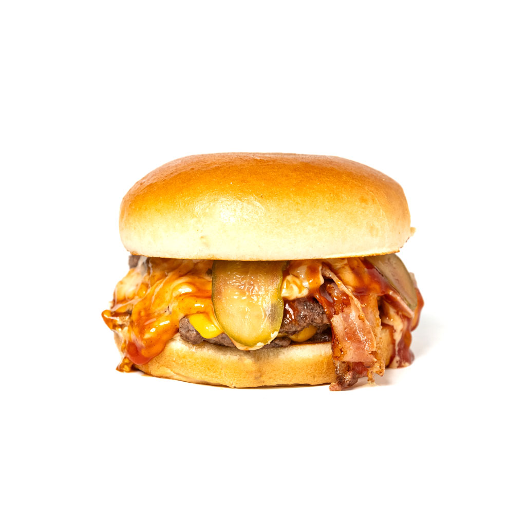 smash szósz, 2x 100g 100%-os marhahúspogácsa, vöröshagyma, dupla cheddar sajt, bacon, BBQ-szósz
