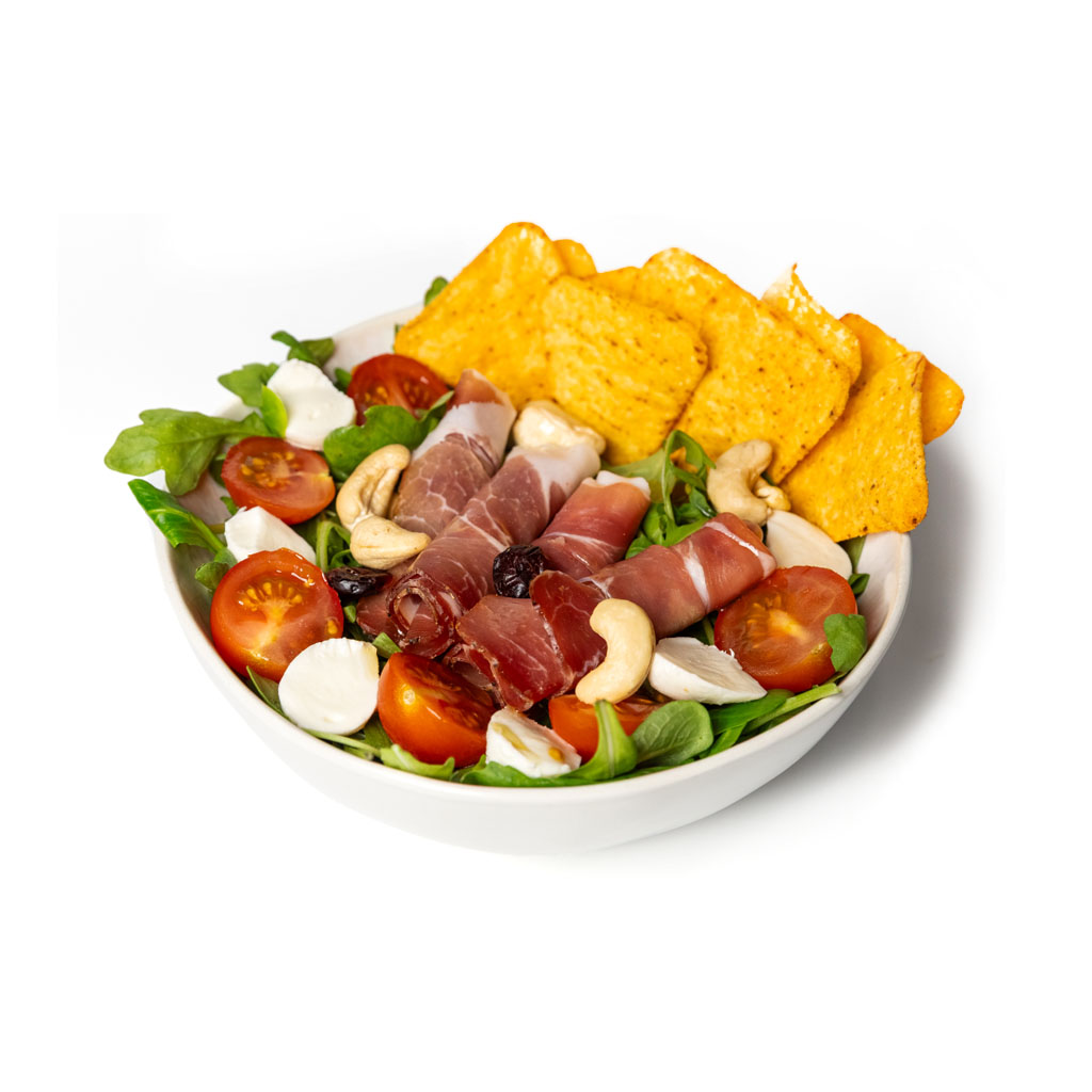 Ruccola, madársaláta, kesudió, nachos, koktélparadicsom, mozzarella, vörös áfonya, fekete erdei sonka, fokhagymás öntet
